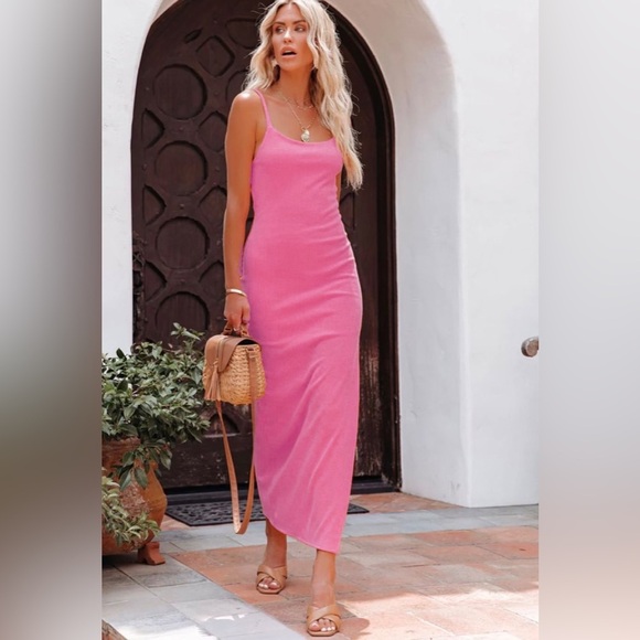 Vici Luna pink ribbed Spaghetti strap Maxi Dress side slit fitted small made USA