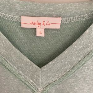 Cozy V-neck tunic in a pretty mint green color. Relaxed fit with textured sleeves. Legging friendly.