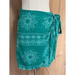 Cute kelly green color with a boho bandana look, Skirt has a side zipper and two wraps that can be tied in front or on each side. Cute and flattering! See photos for measurements and material care.