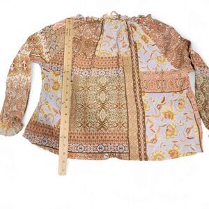 Embrace bohemian elegance with this Vici Peasant Blouse Top in Women’s XL. Crafted with a charming patchwork design, this blouse showcases a harmonious blend of dusty pink, mauve, and lavender hues, perfect for adding a vibrant touch to any outfit. The boho and gypsy styles are beautifully represented through its relaxed fit and intricate detailing, making it ideal for both casual wear and special occasions. Made from soft, comfortable rayon, this long-sleeved blouse offers a flattering silhouette that pairs effortlessly with jeans, skirts, or layered under jackets. Pre-owned and in great condition, this versatile piece is a must-have for any fashion-forward wardrobe.