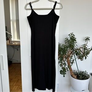 The Vici Black Ribbed Midi Dress is a sophisticated choice for a night out or cocktail event. This sleeveless dress features a sleek adjustable spaghetti strap neckline and a form-fitting silhouette that falls elegantly below the knee. Crafted from a solid black fabric, it offers a minimalist yet chic look that is both versatile and timeless.