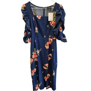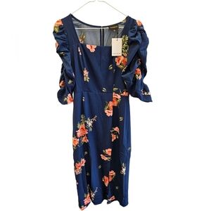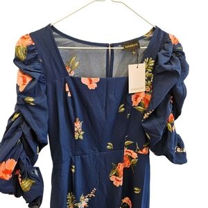 Vici SugarLips Life is Peachy Blue Floral Ruched Puff Sleeve Midi Dress NEW