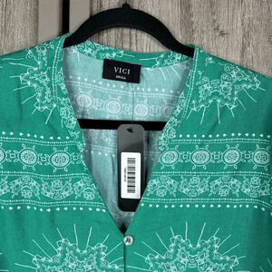 NWT Vici Top Womens Small Green White Long Bell Sleeve V Neckline Button Up Front