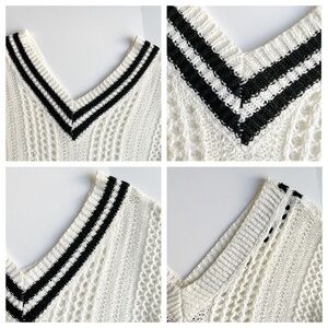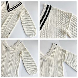 Vici University Varsity Knit Sweater in cream and black. Stretchy cream open knit fabrication. The v-neckline is trimmed in dual black stripes for the ultimate preppy feel. Designed to fit relaxed and slightly oversized with long billowy sleeves. Finished with ribbed edges. Worn but in excellent condition with no visible signs of wear. Approx. 26.5” long and 21” across from armpit to armpit.