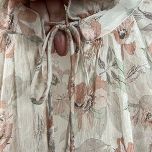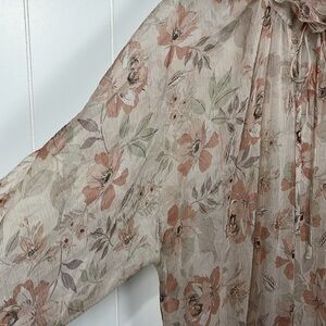 Vici Womens Midi Dress S Cream Pale Pink Pullover Drop Waist Peplum Hem Long Sleeves w/Ruffle Cuff 100% Poly Floral No Liner Feminine Dainty Beautiful EUC