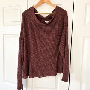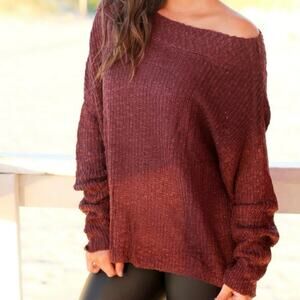 Cozy maroon knit sweater from Vici featuring a wide draped neckline that can be worn off one shoulder for a relaxed, slouchy look. Soft medium-weight knit with slight texture and stretch—perfect for layering or pairing with leggings or jeans.