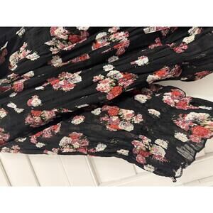 Features a black base with a vibrant floral print in red, white, and pink tones.