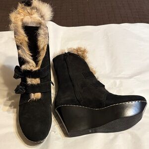Stay warm with Vicini winter boots. Black exterior with tan faux fur trim. Stylish and cozy for cold weather. 3 in wedge heels