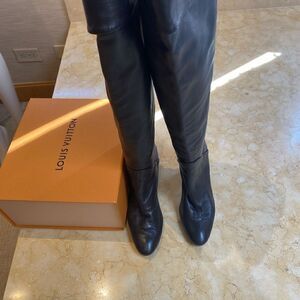Vicini tall, black leather over the knee boots with 3 inch heel. 23 inches from bottom of the hill to the top of the boot. Can be worn folded over as well. Very gently worn and in great condition. Size 40 or 10.