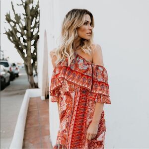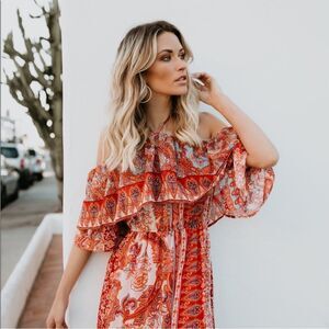 This Sevilla Ruffle Maxi Dress is a gorgeous red and orange maxi with a beautiful shelf off the shoulder style.