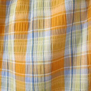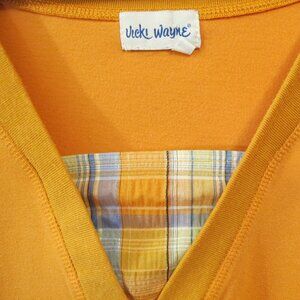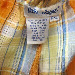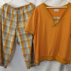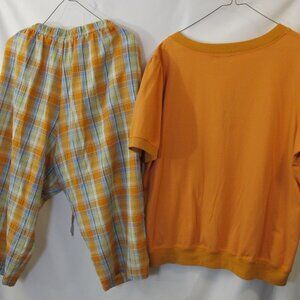 Vicki Wayne 2-piece outfit. The top is 1x in orange with plaid neck inset matching the pants and ribbed hems. The cropped pants have a plaid pattern of orange, blue, and green with silver threads running vertically. The pants have an elastic waist with drawstring tie and on-seam pockets.