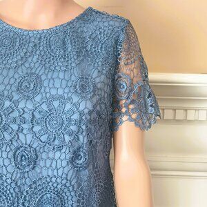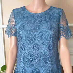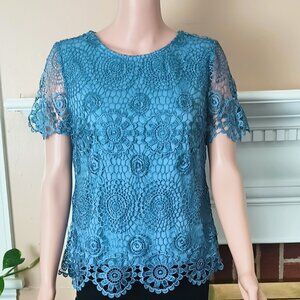 Vicki Wayne Blue Crochet Top Short Sleeve Scalloped Lace Lined Blouse
