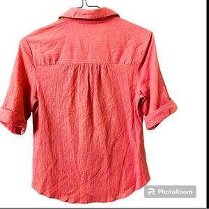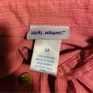 Vicki Wayne Button Down Short Sleeves Collar Rose Pink Natural Cotton Blouse. Vintage but in good condition. 100% natural fiber cotton gauze material, short sleeves with roll up fold, fold down collar, button closure, front button pocket. Size medium. In good condition.