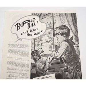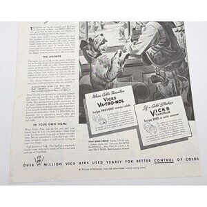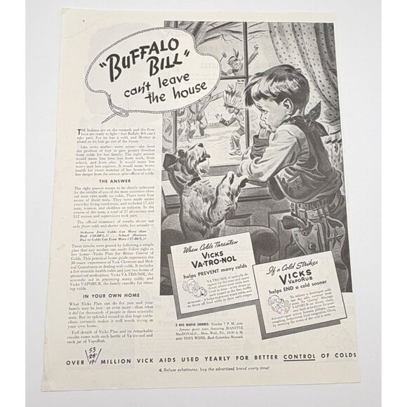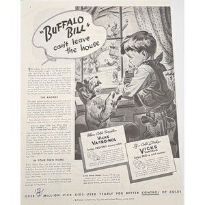 This charming vintage 1930s advertisement for Vicks Vaporub and Va-tro-nol captures the nostalgia and practicality of decades past. Featuring "Buffalo Bill," a young boy confined by a common winter cold, this piece illustrates medicinal solutions from a simpler time. Complete with delightful art and historical details, it showcases bygone health practices.