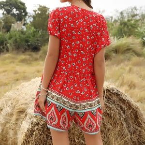 Vicky and Lucas red festive floral Arabesque loose fitting button front romper S