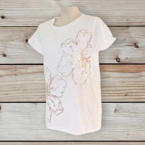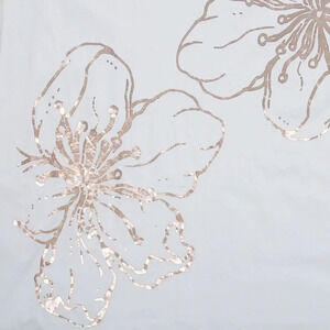 Bright white with shiny rose-gold loosely drawn flowers over the front