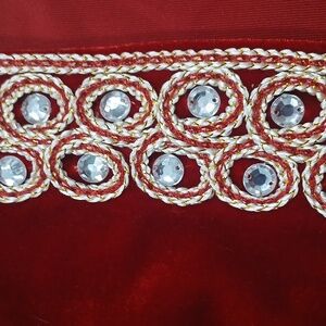 Elegant red velvet jacket. Intricate gold embellishments. Perfect for special occasions.