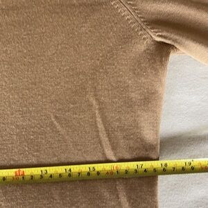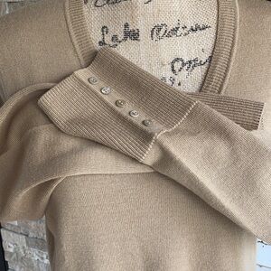 Great condition Victor Alfaro size L 100% wool tan/camel colored V-neck sweater. Cute button detail at wrist.