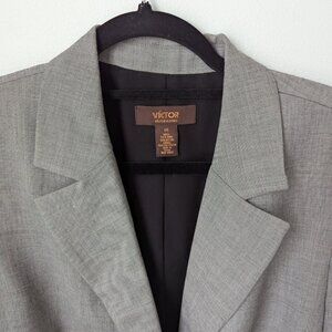 Victor Alfaro Women's Gray Wool-Rayon Blend Suit Set. 54% wool, 46% rayon. Lined in 100% poly. Jacket has padded shoulders for defined fit. Two button front enclosure, 3 buttons on cuffs. Two faux front pockets. 6" slits on the back. Size 14 measuring 22x24. Trousers are straight leg style. w-18, i-32, r-11, l-43. Two front and two back pockets. Set is in excellent condition.