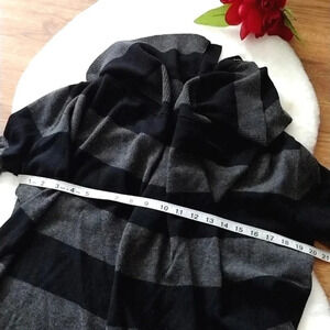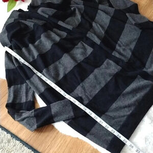 Women's Size Medium Wool Blend Striped Gray and Black Oversized Drapey Cardigan Sweater. Button Up, Lagenlook Loose Fitting Style at Body, Cardigan, Fitted at Arms, Long Sleeve, Ribbed Sleeves. 53% Wool. Hand Wash. Excellent Condition, No Holes or Stains. Smoke Free Home, Fast Shipping.