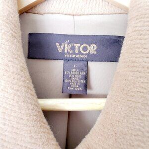 A coat with a very classic and timeless silhouette. This beautiful Victor Victor Alfaro camel colored coat is made from wool and rabbit hair with a very soft hand. 3/4 length dolman sleeves are very feminine and great for a cold evening. 4 tortoise shell secure the coat and the hem falls just below the knee on a 5 ft. 6 in. gal. It's a coat that checks the boxes of cozy and beauty!