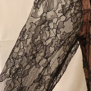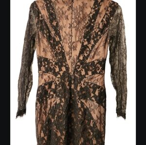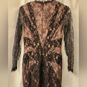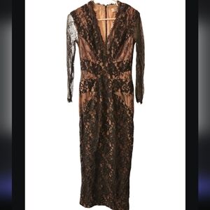 Chic midi dress with intricate black lace overlay. Tan underlay enhances the elegant design. Perfect for formal events. ptp 16.5,waist 26. Hips 37. length 50. ab 200