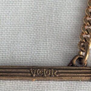 This vintage pendant tie bar from VICTOR is a unique addition to any collection. Made of brass with a gold color, it features an adjustable design and is handcrafted in the United States. The tie bar/clip is perfect for all occasions and has a welding and cutting theme. Measuring 2.1/8 inches in length, this unisex adults accessory has no antique features, is not signed, and has no stones. The base metal is brass with an unknown metal purity. This item is not customized and has no secondary stones. Purchase this handmade tie bar/clip today and add a touch of vintage style to your jewelry collection.