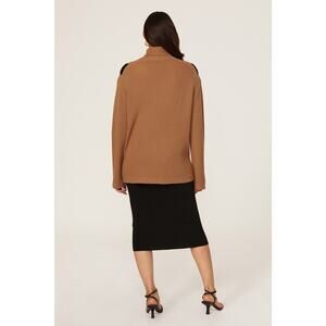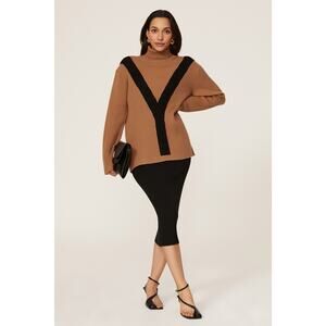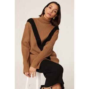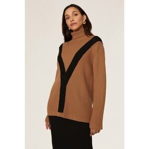 Camel and black knit (100% Wool). Sweater. Turtleneck. Long sleeves. Pull on. 25" from shoulder to hemline. Imported.