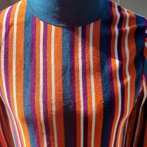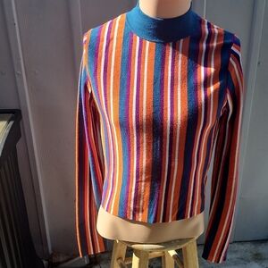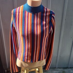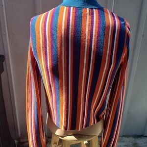 This eye-catching blouse by Victor Glemaud showcases a vibrant blend of orange and blue in a fitted design with long sleeves. The bold vertical stripes lend a retro-inspired charm, making it a versatile addition to any wardrobe. Crafted from a comfortable knit fabric, it's perfect for both casual outings and dressy occasions.
