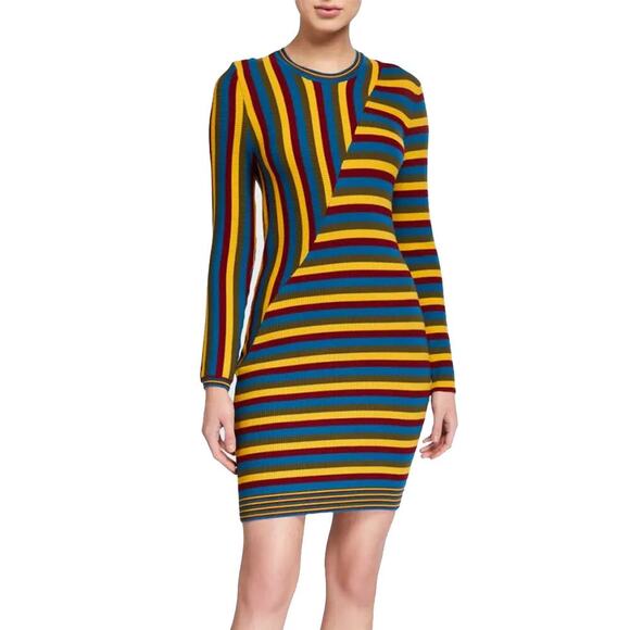 Victor Glemaud multicolor stripe long sleeve dress. Bold multicolored striped ribbed knit fabrication. Crew neckline. Pullover style. Form fitting silhouette. In perfect condition. Size medium - 16" pit to pit; 13" waist; 37" length from shoulder.