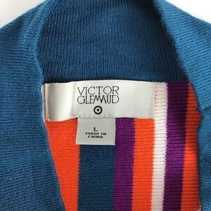 - Description: Give your knitwear collection a bright splash with the Striped Mock Turtleneck Pullover Sweater from Victor Glemaud x Target. The sweater has a casual silhouette created by a regular fit and at-waist length, but gets dressed up a touch with a mock turtleneck. Vertical stripes in dark teal, orange, purple and white add some interest and showcase designer Victor Glemaud's love of stripes, colorblocking and vibrancy. Wear the sweater with skinny jeans and booties for a casual ensemble, or go dressier with a pencil skirt and pumps.