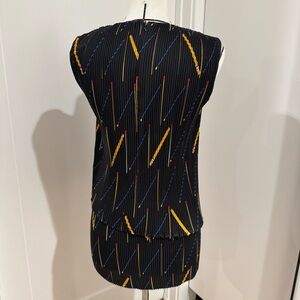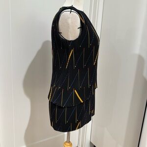 Chic black blouse with vibrant blue and yellow lines. Sleeveless and stylish. Perfect for any occasion. Needs dry cleaning great condition