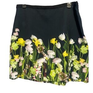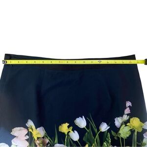 Chic black mini skirt. Features colorful floral patterns. Stylish and versatile.