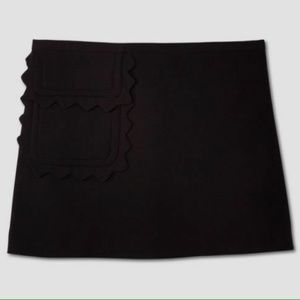 Very cute black Victoria Beckham skirt with a scalloped pocket on the front. This is a mini skirt that measures 18.5 inches from the waist. The waist itself measures about 48 inches.