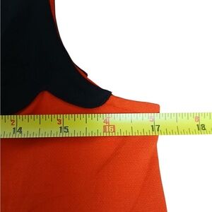 Elegant mini dress with striking black and orange contrast. Features a sleeveless design and flared hem. Ideal for a sophisticated look.