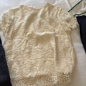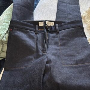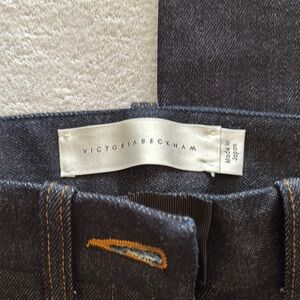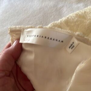 Victoria Beckham bundle. Size 28 Stylish dark denim pants with contrast stitching. Ideal for a modern look. Size 8 lace blouse with lining. Fringe hem and sleeves. Beautiful cream color. Paired together is a great dinner look. Smoke free home. New these were $420.00.