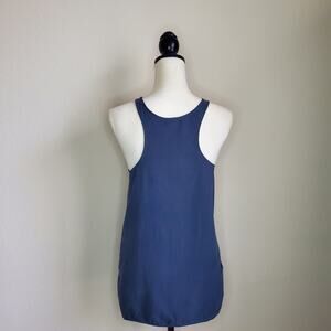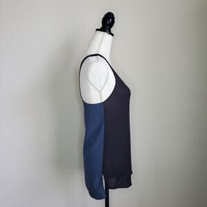 Designed with a flattering tunic length, this piece blends luxury and versatility, making it perfect for both casual and dressy looks. The black front and blue back create a striking contrast, while the semi-sheer lyocell and silk fabric adds an elegant touch. Featuring a scoop neck, racerback, and split hem, this pullover tank is a timeless essential with modern sophistication.