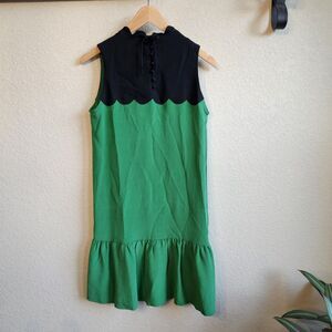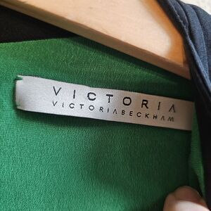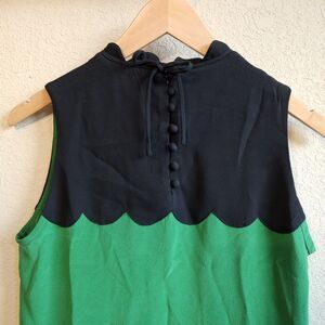 Those rare, hard to find colorway of designer Victoria Beckham US 8 Silk Scalloped Knee-length Dress in Green/Black is a sophisticated and stylish choice for any formal occasion. Made from a luxurious spandex and polyester blend, this runway dress features a colorblock pattern and a flattering sheath style. With a sleeveless design and button closure, this dress is perfect for weddings, parties, or cocktail events during the summer and spring seasons. The elegant scalloped hem adds a touch of detail to this chic and timeless piece, making it a must-have for any fashion-forward wardrobe. Pre-owned. HTF.