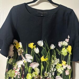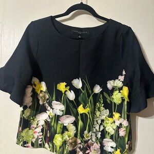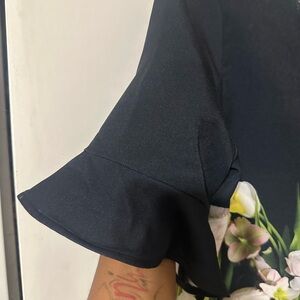 This stylish blouse from Victoria Beckham for Target features a boxy silhouette with flutter sleeves, offering a chic and modern look. The top is crafted in a deep blue and black color palette, complemented by a vibrant floral pattern that adds a touch of elegance. Perfect for any occasion, this blouse is a versatile addition to your wardrobe.