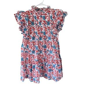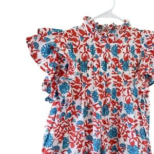 Elegant dress with vibrant floral design. Features ruffle neckline and sleeves.