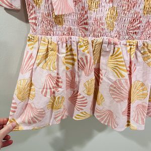 Victoria Dunn x Kathleen Maeve colab. Taylor Smocked Tank Top. Seashell Print. Bow Tie Sleeveless. Cotton Linen Blend. Perfect for summer weather and resort, travel, cruise wear.