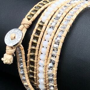 Victoria Emerson Bracelet 34" Beaded Boho Wrap Neutral Tan Crystals w/ Pouch