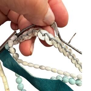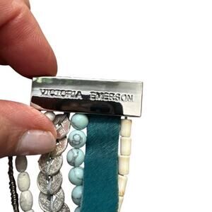 Excellent preowned condition. This is a magnetic bracelet by. Victoria Emerson. Six different strands are included and attached to a strong double magnet closure. Creamy beads along with a strip of teal colored leather, turquoise, beads, gray beads with little tiny, silver, wings, tiny silver, coins, and white beads. bracelet comes with a nice cotton storage bag.
