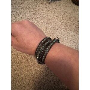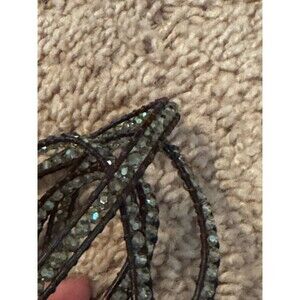 Stylish and boho-chic wrap bracelet from Victoria Emerson. Features sparkling clear beads woven onto genuine brown leather with a secure button closure. Perfect for stacking or wearing solo for a subtle statement. Gently worn and in great condition—adds a touch of shimmer to any outfit.
