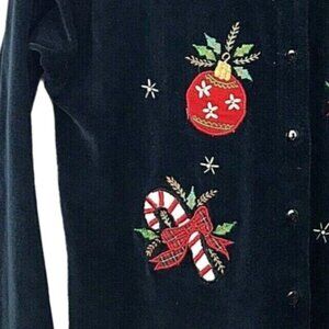 Vintage Victoria Jones black velour button-front cardigan sweater featuring festive appliqué and embroidered holiday designs with ornaments, candy canes, and snowflakes. This soft, long-sleeve top is perfect for holiday gatherings, winter festivities, or adding a touch of retro charm to your wardrobe. A cozy and stylish choice for the season! Hand wash only to preserve its quality and design.