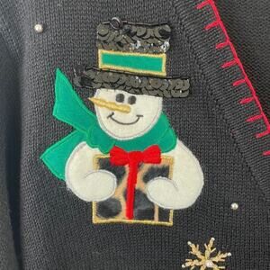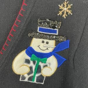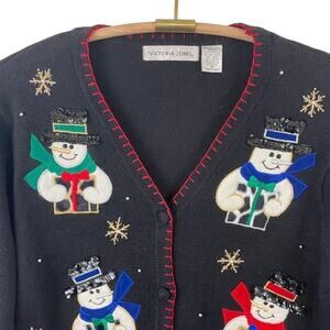Victoria Jones Christmas Sweater Snowman Ugly Christmas. Size Medium. Adorable sweater for the holiday season decorated with snowmen & snowflakes. Accented with felt, faux fur, velveteen, beading, sequins & metallic thread. Crochet- covered buttons down front and edged in a red blanket stitch. Excellent used condition.