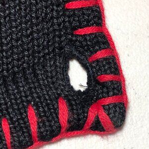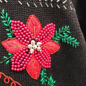 Beautiful Ugly Christmas Sweater Victoria Jones Embroidered Christmas Cardigan Black Beaded Embellishments Size L. Has Poinsettia, Snow Man, Christmas Tree, and Candle. There is one button on the bottom that is missing. Cant really tell. Please see pictures for more detail.