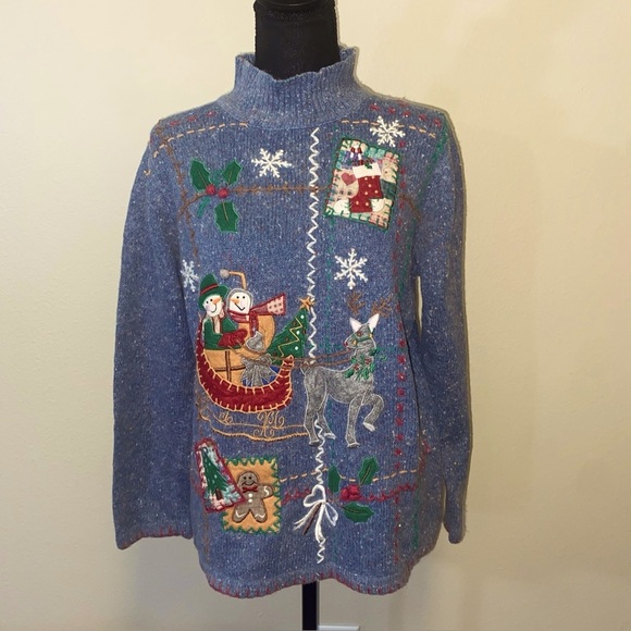 Victoria Jones Sleigh Riding Snowman Christmas Sweater Size Large Ugly Vintage
