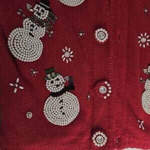 Victoria Jones VTG Christmas Red Cardigan Medium Elegant Beaded Pearls Snowman