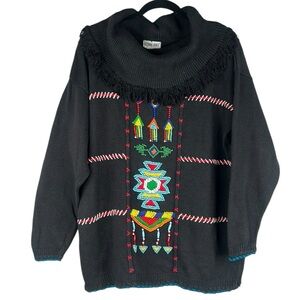 Victoria Jones Vintage Black Knit Aztec Boho Beaded Cowl Neck Sweater Size Large